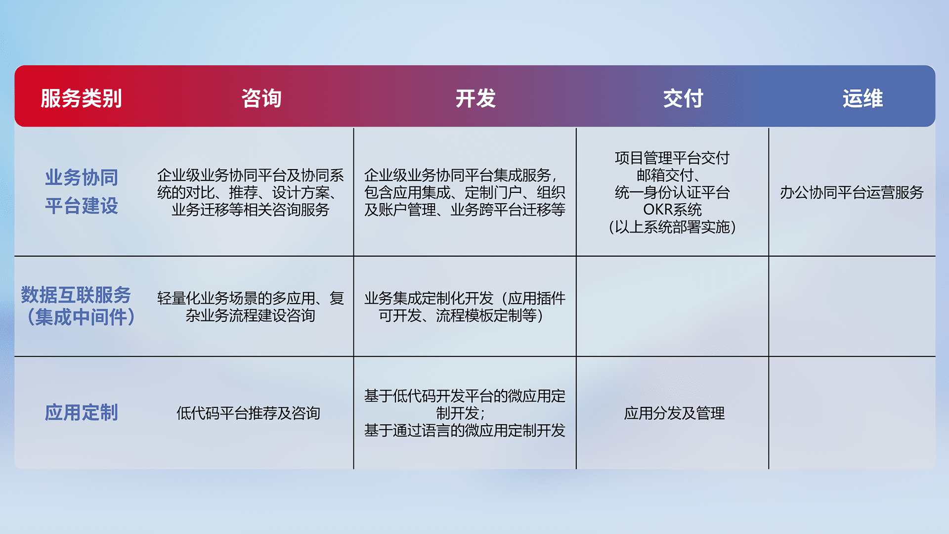 针对钉钉、、企微、、、、IDaas等平台级产品提供产品的规划、、、、方案、、、交付、、定制化开发等服务,,,实现如统一协同办公、、智能客户服务、、、、混合会议管理、、、、智能数据查询、、、等业务场景,,实现数字化转型。。